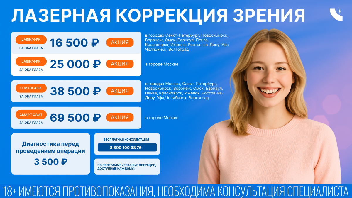 Также сейчас его можно сделать с наибольшей выгодой, 38 500 р. вместо 70 000 рублей, за оба глаза.